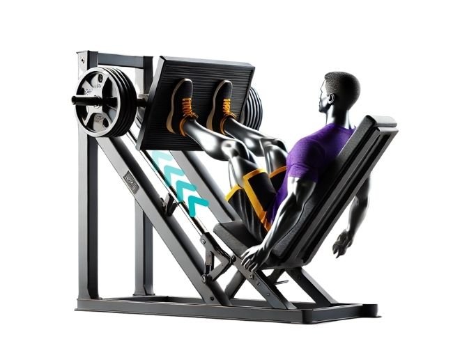 Coloca los pies en la plataforma separados al ancho de los hombros. Desciende con control hasta que las rodillas formen un ángulo de 90°, luego empuja con fuerza sin bloquear las articulaciones. Mantén la espalda baja pegada al respaldo.