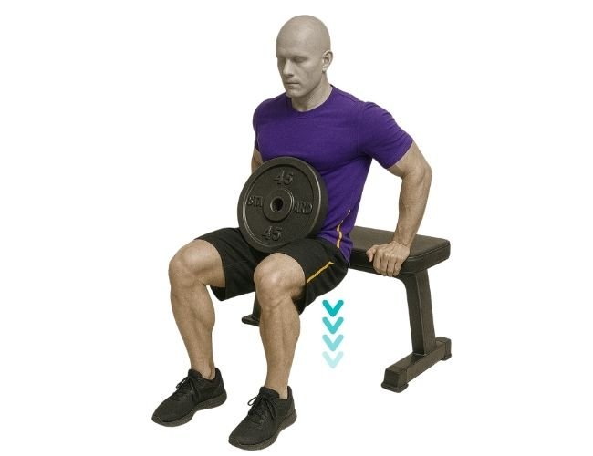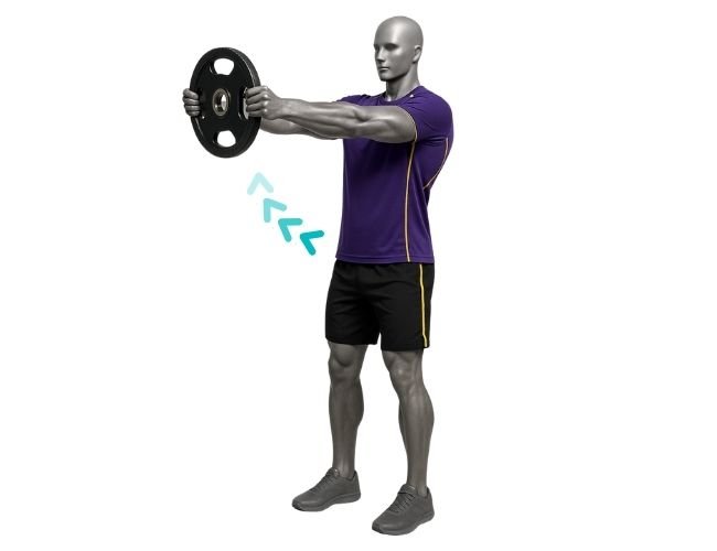 Sujeta un disco con ambas manos frente al cuerpo, con los brazos estirados y una leve flexión en los codos. Desde esa posición, eleva el disco hacia el frente hasta la altura de los ojos. Mantén el core contraído y evita balancearte o arquear la espalda. Haz una breve pausa arriba y baja el disco lentamente controlando el movimiento.