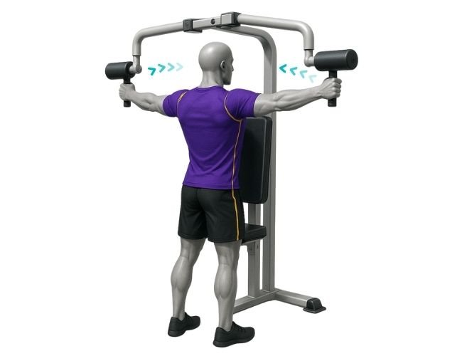 Sujeta las agarraderas con los brazos estirados al frente y con una ligera flexión en los codos. Abre los brazos hacia los lados manteniendo el pecho firme contra el respaldo. Contrae los deltoides posteriores al llegar al final del movimiento. Haz una breve pausa y regresa lentamente a la posición inicial controlando el peso.