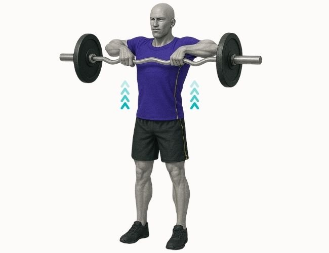 De pie, con una barra frente a los muslos, sujétala con un agarre al ancho de los hombros y brazos completamente estirados. Sin flexionar los codos, eleva los hombros hacia las orejas lo más alto que puedas. Mantén la contracción en la parte superior durante un segundo y luego baja lentamente a la posición inicial. Mantén el core activo y evita movimientos bruscos.
