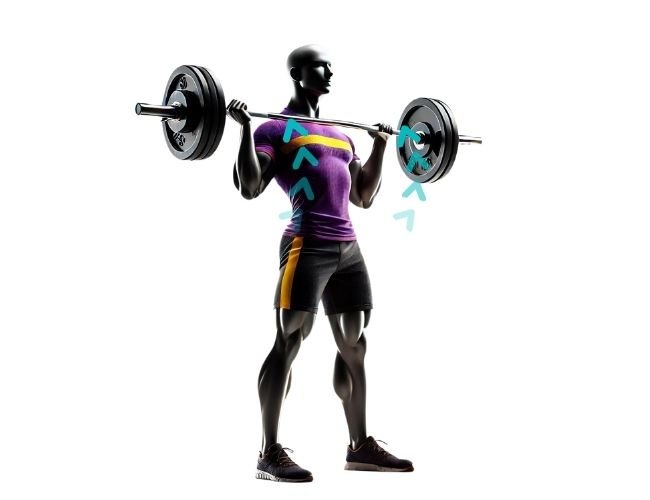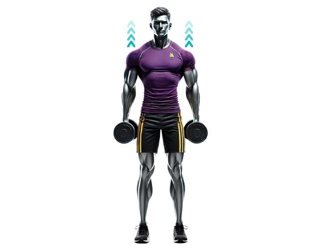Trabaja trapecio superior con elevaciones controladas, sin balanceo corporal ni rotación de hombros.