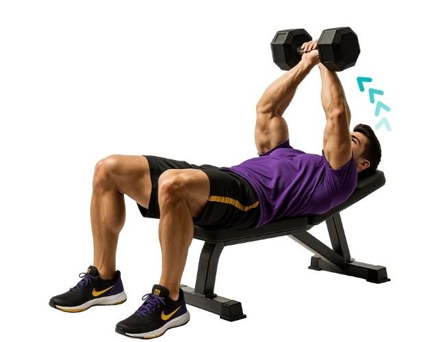 Enfocado en fase concéntrica lenta, cuidando no balancear el cuerpo ni bloquear codos en la extensión.